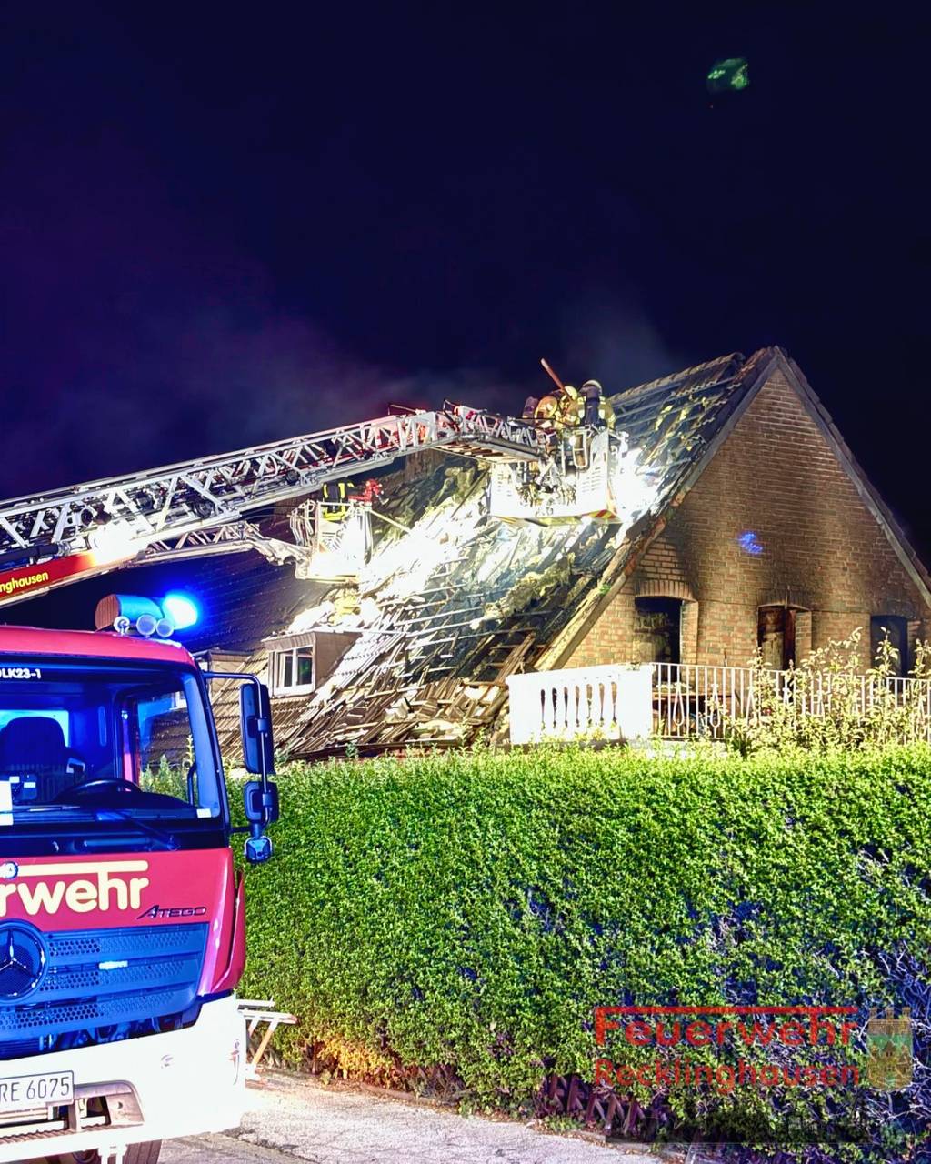 Der Brand einer Doppelhaushälfte in Recklinghausen-Ost hat die Feuerwehr in der Nacht zu Dienstag stundenlang beschäftigt. Das Feuer brach gegen 2 Uhr auf der Bromberger Straße aus. Das komplette Obergeschoss stand in Flammen, sie griffen auf das Dach über. Dichter Rauch zog in den Himmel. Der war zwischenzeitlich so stark, dass die Feuerwehr sogar eine Meldung über die NINA-Warn-App herausgab. Anwohner im Ostviertel sollten ihre Fenster und Türen schließen.