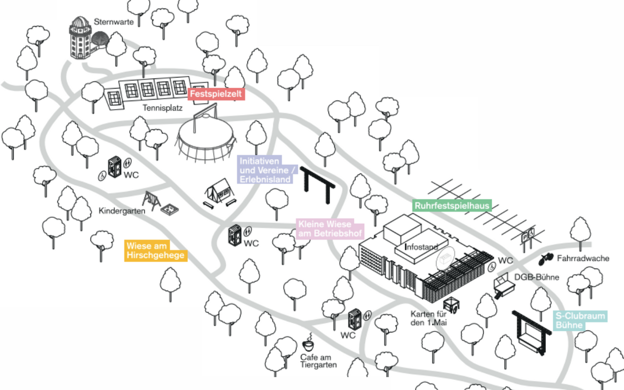 Zwischen 12 und 18 Uhr treten an verschiedenen Orten immer mal wieder Bands und Walking Acts auf – unter anderem das PortAL Formidabel, das Samba-Syndikat, das Figurentheater Kolleg Bochum und der Magische Zirkel von Dortmund. Mehr als 20 Initiativen und Vereine stellen ihre Arbeit vor. Im Erlebnisland „Kinder stark machen“ dreht sich alles um die Themen Mut, Anerkennung und Teamgeist. Auch das Herwig-Blankertz-Berufskolleg präsentiert ein tolles Programm für Kinder. Auf der Wiese hinter dem Festspielhaus gibt es diverse Stände für Speisen & Getränke.