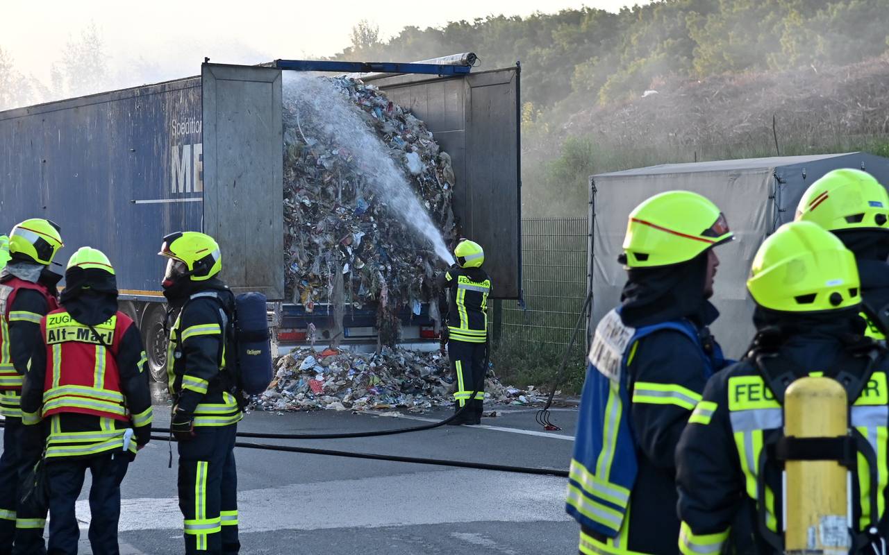 Die Feuerwehr rückte an und kümmerte sich um den Brand: Von oben über eine Steckleiter und auch durch die geöffnete Heckklappe wurde der Brand gelöscht. Um wirklich alles unter Kontrolle zu bringen, wurde der brennende Müll dann noch direkt vor Ort mit einem Teleskoplader ausgeladen und auf der Straße verteilt, um auch die letzten Glutnester abzulöschen. Nach über anderthalb Stunden hatten die Einsatzkräfte die Lage im Griff. Für die Zeit war die Straße in dem Bereich komplett gesperrt. Verletzt wurde zum Glück niemand, und auch größere Schäden gab’s nach ersten Infos nicht.