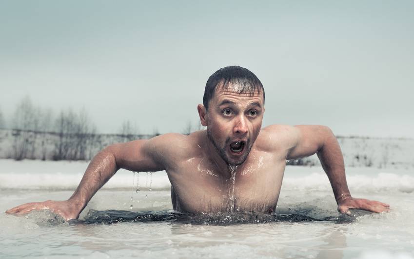Neujahrsschwimmer springen in den kalten Stausee
