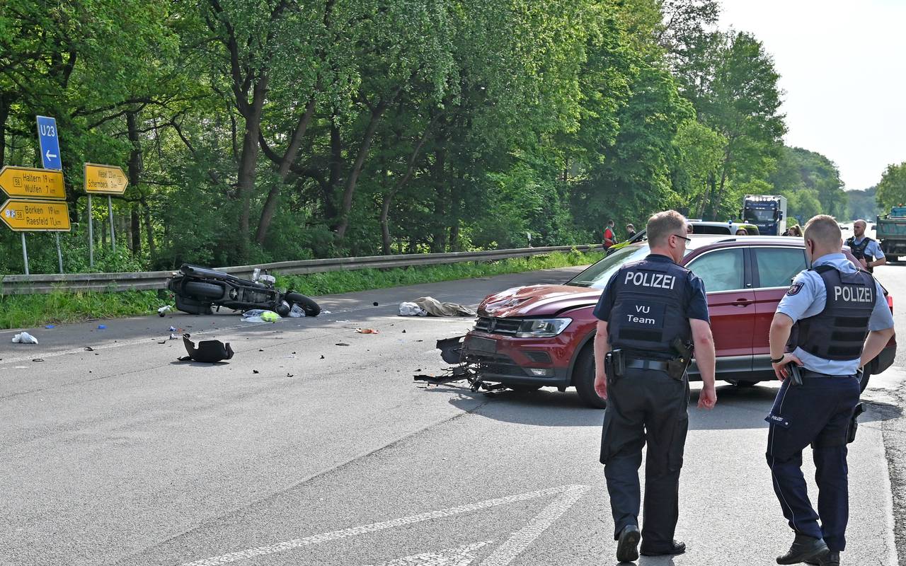 Gegen 16:10 Uhr am Freitagnachmittag (10. Mai) kam es an der B58 /Freudenbergstraße in Höhe der Autobahnauffahrt zur A31 in Richtung Emden zu einem schweren Unfall. Ein 68jähriger Motorradfahrer aus Duisburg war mit dem Auto einer 44jährigen Dorstenerin zusammengekracht. Der Duisburger hatte eine 42jährige Beifahrerin aus Dinslaken auf dem Motorrad.